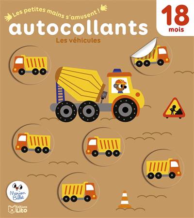 Des autocollants sur le thème des véhicules. L'enfant doit les coller sur la bonne image en s'aidant de celui déjà placé : les camions sur le chantier, les bateaux sur l'eau, les voitures sur la route, entre autres.