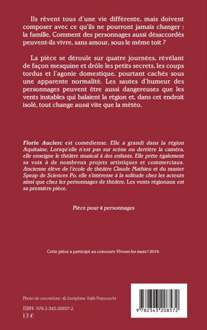 Ils rêvent tous d'une vie différente, mais doivent composer avec ce qu'ils ne pourront jamais changer: la famille. Comment des personnages aussi désaccordés peuvent-ils vivre, sans amour, sous le même toit ?La pièce se déroule sur quatre journées, révélant de façon mesquine et drôle les petits secrets, les coups tordus et l'agonie domestique, pourtant cachés sous une apparente normalité. Les sautes d'humeur des personnages peuvent être aussi dangereuses que les vents instables qui balaient la région et, dans cet endroit isolé, tout change aussi vite que la météo.