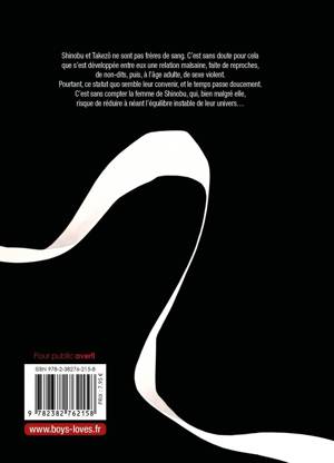 Shinobu et Takezô ne sont pas frères de sang. C'est sans doute pour cela que s'est développée entre eux une relation malsaine, faite de reproches, de non-dits, puis, à l'âge adulte, de sexe violent. Pourtant, ce statut quo semble leur convenir, et le temps passe doucement. C'est sans compter la femme de Shinobu, qui, bien malgré elle, risque de réduire à néant l'équilibre instable de leur univers..."