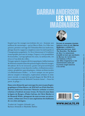 Inspiré par les voyages surréalistes de cet « homme au million de mensonges » qu'est Marco Polo, «Les Villes Imaginaires», premier récit de l'Anglais Darran Anderson, plonge dans les rapports complexes entre les métropoles et l'imagination populaire. Le livre traverse le temps, l'espace et les possibilités fictionnelles, cartographiant les sons, la mélancolie, les rêves et l'au-delà des villes. Voyages opiacés, longues dérives aquatiques, hallucinations de prisonniers entassés dans des prisons logées dans les nuages, décadence de la vie nocturne, gratte-ciel post-soviétiques sans fin, golems errant dans les ruelles, civilisations souterraines, prophéties apocalyptiques, visions architecturales à la Buckminster Fuller... ce livre unique en son genre qui alterne utopies et dystopies, exploration urbaine et résistance sociale, reprend le grand slogan de Mai 68 là où les contemporains de Debord l'avaient laissé : « Sous les pavés, la plage. » Dans cette démarche qui dépasse les oeuvres psychogéographiques d'Alan Moore, Will Self ou Iain Sinclair, Darran Anderson réinvente l'histoire urbaine et notre relation à l'endroit où nous vivons. Il s'inscrit ainsi dans la lignée de Borgès, d'Italo Calvino, Chris Marker et Kenneth White, plongeant du macrocosme au microcosme, collant aux rêves et aux aspirations des habitants de ces cités oniriques.