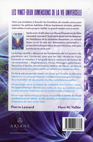 Le premier tome de la série Les Douze Dimensions de l’être conscient a exploré comment les facultés spirituelles fondamentales de l’être humain engagé dans un profond processus de transformation intérieure participent directement à la perception d’une réalité élargie. Ainsi, en développant ces facultés, l’individu affine sa maîtrise du parcours d’éveil, se libérant progressivement des limitations de la troisième dimension pour entrer en résonance avec des réalités plus vastes – celles de la Terre et au-delà. Dans ce deuxième tome, l’être éveillé s’apprête à franchir un merveilleux portail marquant le début de son grand passage vers les dimensions universelles, son véritable terrain d’exploration. On y proposera des enseignements précieux pour amener le lecteur à comprendre la nature de cette transition – du planétaire à l’universel. À titre d’exemple, voici quelques Dimensions qui y seront explorées : 1. Dimension de la vie d’êtres hautement évolués sur Vénus et Saturne, ainsi que sur les systèmes d’Arcturus, de Sirius et d’Orion. 2. Dimension du plan astral universel : Les plans éthérique, astral et mental se déploient dans l’univers selon des octaves dimensionnelles. Découvrez la structure sous-jacente à ces plans. 3. Dimension d’êtres qui oeuvrent à la régénérescence de systèmes planétaires, solaires et galactiques : Rencontrez les architectes cosmiques qui restaurent et harmonisent les énergies partout dans le cosmos, assurant ainsi la viabilité et la vitalité de multiples systèmes stellaires. 4. Dimension des devas et création d’espèces végétales sur différentes planètes : Apprenez sur les devas, ces esprits de la nature qui conçoivent et maintiennent la diversité biologique partout dans l’univers, enrichissant la vie sur de nombreuses planètes. 5. Dimension de l’équilibre tonal et de l’OM universels : L’évolution des structures galactiques suit des schémas vibratoires selon des tonalités spécifiques émises par des êtres hautement évolués. À la source se trouve l’OM primordial, le fondement vibratoire qui soutient et pénètre toute création.