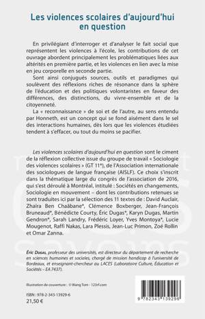Il s'agit d'interroger le fait social que représentent les violences à l'école : d'une part, les problématiques liées aux altérités puis les violences en lien avec la mise en jeu corporelle. Sont conjugués sources, outils et paradigmes qui soulèvent des réflexions riches de résonance dans la sphère de l'éducation et des politiques volontaristes en faveur des différences, des distinctions, du vivre-ensemble et de la citoyenneté.
