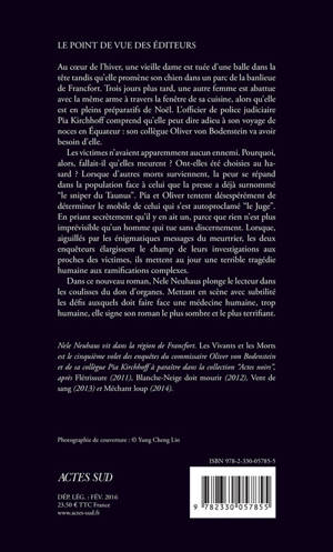 Au coeur de l'hiver, une vieille dame est tuée d'une balle dans la tête tandis qu'elle promène son chien dans un parc de la banlieue de Francfort. Trois jours plus tard, une autre femme est abattue avec la même arme à travers la fenêtre de sa cuisine, alors qu'elle est en pleins préparatifs de Noël. L'officier de police judiciaire Pia Kirchhoff comprend qu'elle peut dire adieu à son voyage de noces en Équateur : son collègue Oliver von Bodenstein va avoir besoin d'elle. Les victimes n'avaient apparemment aucun ennemi. Pourquoi, alors, fallait-il qu'elles meurent ? Ont-elles été choisies au hasard ? Lorsque d'autres morts surviennent, la peur se répand dans la population face à celui que la presse a déjà surnommé "le sniper du Taunus". Pia et Oliver tentent désespérément de déterminer le mobile de celui qui s'est autoproclamé "le Juge". En priant secrètement qu'il y en ait un, parce que rien n'est plus imprévisible qu'un homme qui tue sans discernement. Lorsque, aiguillés par les énigmatiques messages du meurtrier, les deux enquêteurs élargissent le champ de leurs investigations aux proches des victimes, ils mettent au jour une terrible tragédie humaine aux ramifications complexes. Dans ce nouveau roman, Nele Neuhaus plonge le lecteur dans les coulisses du don d'organes. Mettant en scène avec subtilité les défis auxquels doit faire face une médecine humaine, trop humaine, elle signe son roman le plus sombre et le plus terrifiant.