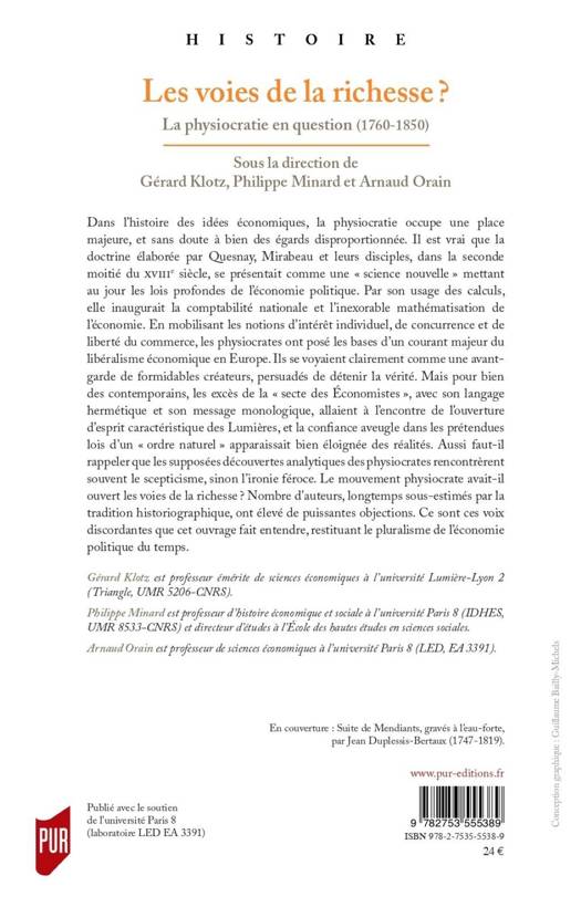 Dans l’histoire des idées économiques, la physiocratie occupe une place majeure, et sans doute à bien des égards disproportionnée. Il est vrai que la doctrine élaborée par Quesnay, Mirabeau et leurs disciples, dans la seconde moitié du XVIIIe siècle, se présentait comme une « science nouvelle » mettant au jour les lois profondes de l’économie politique. Par son usage des calculs, elle inaugurait la comptabilité nationale et l’inexorable mathématisation de l’économie. En mobilisant les notions d’intérêt individuel, de concurrence et de liberté du commerce, les physiocrates ont posé les bases d’un courant majeur du libéralisme économique en Europe. Ils se voyaient clairement comme une avant-garde de formidables créateurs, persuadés de détenir la vérité. Mais pour bien des contemporains, les excès de la « secte des Économistes », avec son langage hermétique et son message monologique, allaient à l’encontre de l’ouverture d’esprit caractéristique des Lumières, et la confiance aveugle dans les prétendues lois d’un « ordre naturel » apparaissait bien éloignée des réalités. Aussi faut-il rappeler que les supposées découvertes analytiques des physiocrates rencontrèrent souvent le scepticisme, sinon l’ironie féroce. Le mouvement physiocrate avait-il ouvert les voies de la richesse ? Nombre d’auteurs, longtemps sous-estimés par la tradition historiographique, ont élevé de puissantes objections. Ce sont ces voix discordantes que cet ouvrage fait entendre, restituant le pluralisme de l’économie politique du temps.