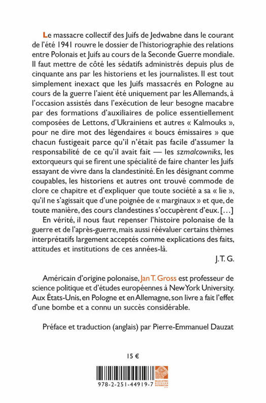 Le massacre collectif des Juifs de Jedwabne dans le courant de l'ete 1941 rouvre le dossier de l'historiographie des relations entre Polonais et Juifs au cours de la Seconde Guerre mondiale. Il faut mettre de cote les sedatifs administres depuis plus de cinquante ans par les historiens et les journalistes. Il est tout simplement inexact que les Juifs massacres en Pologne au cours de la guerre l'aient ete uniquement par les Allemands, a l'occasion assistes dans l'execution de leur besogne macabre par des formations d'auxiliaires de police essentiellement composees de Lettons, d'Ukrainiens et autres Kalmouks , pour ne dire mot des legendaires boucs emissaires que chacun fustigeait parce qu'il n'etait pas facile d'assumer la responsabilite de ce qu'il avait fait - les szmalcowniks, les extorqueurs qui se firent une specialite de faire chanter les Juifs essayant de vivre dans la clandestinite. En les designant comme coupables, les historiens et autres ont trouve commode de clore ce chapitre et d'expliquer que toute societe a sa lie , qu'il ne s'agissait que d'une poignee de marginaux et que, de toute maniere, des cours clandestines s'occuperent d'eux. [...]En verite, il nous faut repenser l'histoire polonaise de la guerre et de l'apres-guerre, mais aussi reevaluer certains themes interpretatifs largement acceptes comme explications des faits, attitudes et institutions de ces annees-la.J. T.