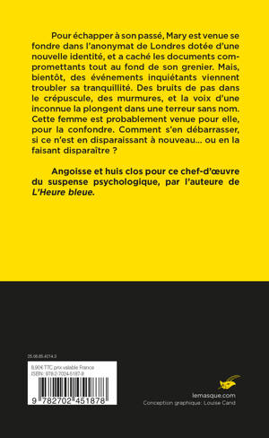Pour échapper à son passé, Mary est venue se fondre dans l’anonymat de Londres dotée d’une nouvelle identité, et a caché les documents compromettants tout au fond de son grenier. Mais, bientôt, des événements inquiétants viennent troubler sa tranquillité. Des bruits de pas dans le crépuscule, des murmures, et la voix d’une inconnue la plongent dans une terreur sans nom. Cette femme est probablement venue pour elle, pour la confondre. Comment s’en débarrasser, si ce n’est en disparaissant à nouveau… ou en la faisant disparaître ?