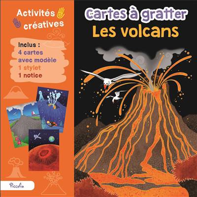 Une pochette de 4 cartes à gratter avec stylet et notice pas à pas sur le thème des volcans.