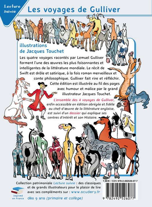 L’ensemble des 4 voyages de Gulliver est ici accessible en édition abrégée et fidèle au chef-d’œuvre de la littérature anglaise. Les voyages de Gulliver sont illustrés en couleurs au fil des pages avec humour et malice par le grand dessinateur Jacques Touchet. De Lilliput au pays des chevaux, en passant par toutes les tailles et toutes les émotions, les quatre voyages racontés par Lemuel Gulliver forment l’une des œuvres les plus foisonnantes et intelligentes de la littérature mondiale. Le récit de Swift est drôle et satirique, à la fois roman merveilleux et conte philosophique. Gulliver fait rire et réfléchir. Souvent tronqué et déformé, ce livre extraordinaire est ici à redécouvrir. Le récit est suivi d’un dossier qui explique ses centres d’intérêt et son Histoire. La collection patrimoniale Lecture suivie présente des classiques illustrés en couleurs au fil du texte. Elle rend accessible des livres classiques pour le plaisir de lire (police espacée et adaptée) avec de très nombreuses illustrations, dans le respect du texte.