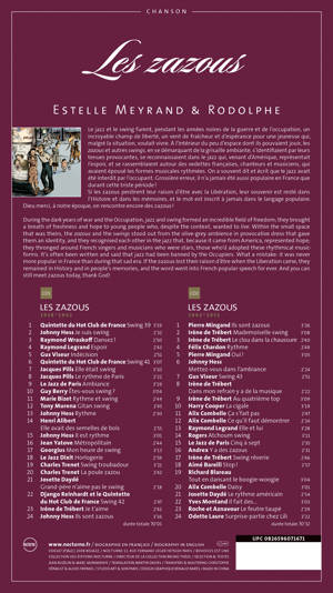 LES ZAZOUS 1939/1945<br /><br /> Le jazz et le swing furent, pendant les années noires de la guerre et de l’occupation, un incroyable champ de liberté, un vent de fraîcheur et d’espérance pour une jeunesse qui, malgré la situation, voulait vivre. À l’intérieur du peu d’espace dont ils pouvaient jouir, les zazous et autres swings, en se démarquant de la grisaille ambiante, s’identifiaient par leurs tenues provocantes, se reconnaissaient dans le jazz qui, venant d’Amérique, représentait l’espoir, et se rassemblaient autour des vedettes françaises, chanteurs et musiciens, qui avaient épousé les formes musicales rythmées. On a souvent dit et écrit que le jazz avait été interdit par l’occupant. Grossière erreur, il n’a jamais été aussi populaire en France que durant cette triste période ! les zazous perdirent leur raison d’être avec la Libération, leur souvenir est resté dans l’Histoire et dans les mémoires, et le mot est inscrit à jamais dans le langage populaire. Dieu merci, à notre époque, on rencontre encore des zazous !<br /><br /> CD 1 Les Zazous 1938-1942<br /><br /> Quintette du Hot Club de France<br /> 1 SWING 39 (D. Reinhardt - S. Grappelli) Decca E 7027 (4969 1/2HPP) 3’19<br /> 21 mars 1939, Stéphane Grappelli (vln), Django Reinhardt, Joseph Reinhardt, Baro Ferret (g), Emmanuel Soudieux (b)<br /><br /> Johnny Hess, acc. d’orchestre, dir. Glykson<br /> 2 JE SUIS SWING (A. Hornez - J. Hess) Pathé PA 1554 (CPT 3998-3) 2’32<br /> 16 novembre 1938, Serge Glykson (as, cl), avec Pierre Allier (tp), Emil Stern (p), Jerry Mengo (dm), etc.<br /><br /> Raymond Wraskoff et son orchestre<br /> 3 DANSEZ ! (R. Wraskoff) Odéon 279 689 (Ki 9154-1) 2’50<br /> 27 décembre 1940<br /><br /> Raymond Legrand et son orchestre, refrain vocal Roger Toussaint<br /> 4 ESPOIR (J. Batell) Columbia DF 2767 (CL 7332-1) 2’43<br /> 6 septembre 1940<br /><br /> Gus Viseur et son orchestre<br /> 5 INDÉCISION (UNDECIDED) (C. Shavers) Columbia DF 2766 (CL 7326-1) 2’51<br /> 9 août 1940, Gus Viseur (acd), avec Matlo et Challun Ferret (g), etc.<br /><br /> Quintette du Hot Club de France, avec Alix Combelle<br /> 6 SWING 41 (D. Reinhardt) Swing SW 95 (OSW 145-1) 3’07<br /> 13 décembre 1940, Hubert Rostaing, Alix Combelle (cl), Django Reinhardt, Joseph Reinhardt (g), Tony Rovira (b), Pierre Fouad (dm)<br /><br /> Jacques Pills, acc. d’orchestre, dir. Raymond Legrand<br /> 7 ELLE ÉTAIT SWING (L. Gasté) Columbia DF 2832 (CL 7455-2) 3’10<br /> 26 juin 1941<br /><br /> Jacques Pills, acc. par le Jazz de Paris, dir. Alix Combelle<br /> 8 LE RYTHME DE PARIS (B. Coquatrix) Columbia DF 2871 (CL 7521-1) 2’22<br /> 28 octobre 1941<br /><br /> Le Jazz de Paris, dir. Alix Combelle<br /> 9 AMBIANCE (IN THE MOOD) (A. Razaf - J. Garland) Swing 105 (OSW 181-1) 3’19<br /> 27 janvier 1941, Alix Combelle (ts, arr), avec Aimé Barelli (tp), Hubert Rostaing (ts), Paul Collot (p), Joseph Reinhardt (g), Tony Rovira (b), Pierre Fouad (dm), etc.<br /><br /> Guy Berry, acc. par Raymond Wraskoff et son orchestre<br /> 10 ETES-VOUS SWING ? (H. Lemarchand - R. Wraskoff) Pathé PA 2034 (CPT 5283-1) 3’04<br /> 7 juillet 1941<br /><br /> Marie Bizet, acc. par l’orch. Pierre Chagnon<br /> 11 RYTHME ET SWING (J. Casanova - P. Durand) Columbia DF 2870 / BF 298 (CL 7525-1) 2’44<br /> 3 novembre 1941<br /><br /> Tony Murena et son ensemble swing<br /> 12 GITAN SWING (T. Murena - P. Ferret) Odéon 281 489 (KI 9221-1) 2’45<br /> 14 juin 1941, Tony Murena (acd), avec Baro et Matlo Ferret<br /><br /> Johnny Hess, acc. d’orchestre, dir. Jacques Météhen<br /> 13 RYTHME (M. Martelier - J. Hess) Pathé PA 2010 (CPT 5287-1) 2’30<br /> 8 juillet 1941<br /><br /> Henri Alibert, acc. orchestre dir. Pierre Chagnon<br /> 14 ELLE AVAIT DES SEMELLES DE BOIS (G. Sellers - R. Vincy - A. Bossy - V. Scotto) Pathé PA 2016 (CPT 5297-1) 2’55<br /> 22 juillet 1941<br /><br /> Johnny Hess, acc. d’orchestre, dir. Jacques Météhen<br /> 15 IL EST RYTHME (M. Martelier - J. Hess) Pathé PA 2011 (CPT 5290-1) 3’01<br /> 8 juillet 1941<br /><br /> Jean Yatove et son grand orchestre de Radio-Paris<br /> 16 MÉTROPOLITAIN (J. Yatove - A. Mirty) Technisonor 404 (ST 719) 2’44<br /> Décembre 1941<br /><br /> Georgius, acc. d’orchestre, dir. Pierre Chagnon<br /> 17 MON HEURE DE SWING (Georgius - H. Rawson) Pathé PA 1989 (CPT 5221-1) 3’13<br /> 25 février 1941<br /><br /> Le Jazz Dixit, dir. Raymond Legrand<br /> 18 HORLOGERIE (R. Legrand) Columbia DF 2831 (CL 7463-1) 2’59<br /> 3 juillet 1941, avec Michel Warlop (vln), Willy Kett (vib), Raymond Wraskoff (p), Loulou Gasté (g), etc.<br /><br /> Charles Trenet, acc. orchestre Jacques Météhen<br /> 19 SWING TROUBADOUR (C. Trenet) Columbia DF 2838 / BF 172 (CL 7479-2) 3’21<br /> 17 juillet 1941<br /><br /> Charles Trenet, acc. par le quintette Léo Chauliac<br /> 20 LA POULE ZAZOU (C. Trenet - L. Chauliac) Rythme C 5042 (16270) 2’42<br /> 28 mai 1942<br /><br /> Josette Daydé, acc. par Pierre Spers et son ensemble rythmiqus<br /> 21 GRAND-PÈRE N’AIME PAS LE SWING (H. Matisson - F. Llenas)<br /> Pathé PA 2090 (CPT 5440-1) 2’18<br /> 19 juin 1942<br /><br /> Django Reinhardt et le Quintette du Hot Club de France<br /> 22 SWING 42 (D. Reinhardt) Swing SW 137 (OSW 229-1) 2’47<br /> 11 septembre 1941, Hubert Rostaing (cl), Django Reinhardt, Eugène Vées (g), Emmanuel Soudieux (b), Pierre Fouad (dm)<br /><br /> Irène de Trébert, acc. par Marius Coste et son orchestre<br /> 23 JE T’AIME (SWING 39) (J. Larue - D. Reinhardt - S. Grappelli)<br /> Columbia DF 2925 (CL 7693-1) 2’42<br /> 25 novembre 1942<br /><br /> Johnny Hess, acc. d’orchestre, dir. Jacques Météhen<br /> 24 ILS SONT ZAZOUS (M. Martelier - J. Hess) Pathé PA 2077 (CPT 5469-1) 3’16<br /> 17 juillet 1942, avec Michel Warlop (vln), etc.<br /><br /> DURÉE TOTALE : 70’01 <br /> CD 2 Les Zazous 1942-1952<br /><br /> Pierre Mingand, acc. par l’orchestre Mi
