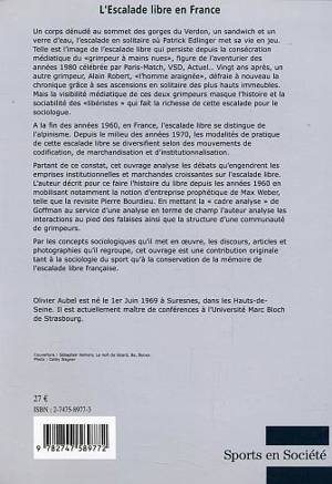 A la fin des années 1960, en France, l'escalade libre se distingue de l'alpinisme. Depuis le milieu des années 1970, les modalités de pratique de cette escalade libre se diversifient selon des mouvements de codification, de marchandisation et d'institutionnalisation. Par les concepts sociologiques qu'il met en oeuvre, les discours, articles et photographies qu'il regroupe, cet ouvrage est une contribution originale tant à la sociologie du sport qu'à la conservation de la mémoire de l'escalade libre française.