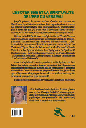 Jusqu’à présent, le lecteur voulant s’initier aux arcanes de l’ésotérisme devait étudier nombres d’ouvrages cherchant à travers des œuvres fondamentales, mais dont le langage ne correspondait plus à notre époque. J’ai donc écrit le livre que j’aurais souhaité rencontrer lors de mes premiers pas en ésotérisme et spiritualité. Ce livre intitulé L’Esotérisme et la Spiritualité de l’Ere du Verseau regroupe donc, en un seul ouvrage, les thèmes majeurs du développement de la conscience et de l’amour : l’ère du Verseau ; l’évolution de la conscience ; l’âme du Monde ; les corps subtils ; les chakras ; l’ego et l’âme ; la réincarnation ; le karma ; la pensée créatrice ; les synchronicités ; les égrégores ; spiritualité et religion ; la symbolique des nombres ; les quatre éléments ; la hiérarchie spirituelle ; les sept rayons d’énergie ; les initiations ; la conscience universelle associant spiritualité contemporaine et métaphysique, ce livre éclaire les enjeux de notre époque, apportant des réponses aux changements qui secouent aujourd’hui les consciences et ébranlent nos sociétés. Dans un monde en perpétuelle évolution, je souhaite que ce livre ouvre des perspectives aux lecteurs et lectrices en quête de sens, de profondeur et de nouveauté.