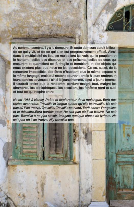 Yannick Torlini explore les effets de la langue sur la destinée humaine et sa portée sur les lieux qu'on habite. En se penchant sur les thèmes de l'amour, de l'échec, de la douleur, la langue qu'il emploie s'enroule autour du surgissement et disparition de l'amour, de l'autre. <br /><br /><br /> Par cette langue «malangue», il capte les émotions qui nous traversent au quotidien dans une écriture de l’empathie.<br /><br /><br /><br /><br /><br /> Comment continuer à dire, à trouver l'espace où rejoindre l'autre malgré la douleur, la fin qui rôde, comment retrouver l'autre dans l'espace habité, dans les lieux désertés. <br /><br /><br /> Le texte de Yannick Torlini tourne autour du lieu, de l’espace, et ce thème est central dans beaucoup d’autres oeuvres qu’il a publié. Le lieu est espace à parcourir, à se rencontrer, un espace pour la solitude, pour l’écriture.