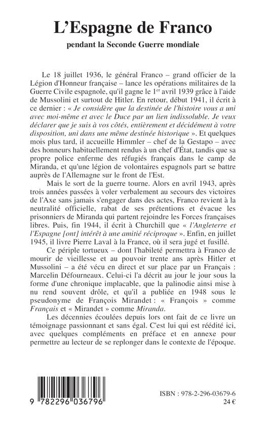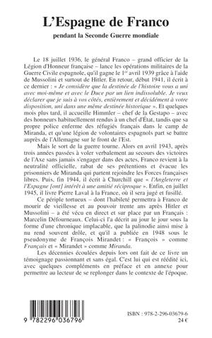 Le 18 juillet 1936, le général Franco lance les opérations militaires de la Guerre Civile espagnole, qu'il gagne le 1er avril 1939 grâce à l'aide de Mussolini et surtout de Hitler. Quelques mois plus tard, il accueille Himmler - chef de la Gestapo - tandis que sa propre police enferme des réfugiés français dans le camp de Miranda, et qu'une légion de volontaires espagnols part se battre auprès de l'Allemagne sur le Front de l'Est. Mais en avril 1943, Franco revient à la neutralité officielle, veut s'allier à Churchill en 1944. En juillet 1945, il livre Pierre Laval à la France.