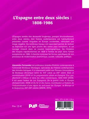 L’Espagne semble être demeurée longtemps, presque structurellement, entre deux siècles. Son histoire contemporaine est habituellement présentée comme singulière en Europe occidentale, véhiculant une image négative. De nombreux travaux ont cependant permis de resituer sa trajectoire sur une ligne proche des autres pays européens, et cet ouvrage s’inscrit dans ce courant historiographique. De l’invasion des troupes napoléoniennes en 1808 à l’entrée du pays dans l’Union européenne en 1986, il cherche à préciser les formes spécifiques de son processus de modernisation économique, sociale, culturelle, politique.