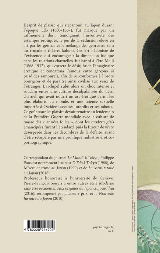 L'esprit de plaisir, qui s'épanouit au Japon durant l'époque Edo (1603-1867), fut marqué par un raffinement dont témoignent l'inventivité des estampes érotiques«,» le jeu de la séduction élevé en art par les geishas et le mélange des genres au sein du truculent théâtre «kabuki». Cet art hédoniste de l'existence, qui encourageait la dimension ludique dans les relations charnelles, fut banni à l'ère Meiji (1868-1912), qui corseta le désir, brida l'imaginaire érotique et condamna l'amour entre garçons, si prisé des samouraïs, afin de se conformer à l'ordre bourgeois et de paraître ainsi civilisé aux yeux de l'étranger. L'archipel subit alors un choc intense et soudain entre une culture déculpabilisée du désir charnel, qui avait nourri un art érotique parmi les plus élaborés au monde, et une science sexuelle importée d'Occident avec ses interdits et ses tabous.