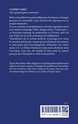 Riche et humble de ses trois millenaires d'existence, la langue grecque est essentielle a qui cherche des reponses sur sa propre humanite. En une centaine d'apophtegmes et de photographies pour leur rendre hommage, Nikos Aliagas saisit l'esprit grec, ce fascinant melange de profondeur et d'ironie, petri de joie d'etre en vie et de conscience de l'ephemere. Thuriferaire de la culture hellene, il partage avec nous les paroles precieuses, en grec puis en francais, des auteurs et amis grecs qui l'accompagnent, d'Homere (VIIIe siecle avant J.-C.) a Alekos Fassianos (1935-2022), donnant ainsi l'occasion, trop rare, de retablir le lien entre la culture grecque de l'Antiquite et celle d'aujourd'hui.