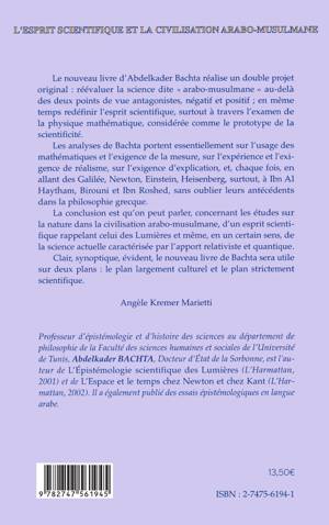 Le nouveau livre d'Abdelkader Bachta réalise un double projet original : réévaluer la science dite "arabo-musulmane" au-delà des deux points de vue antagonistes, négatif et positif; en même temps redéfinir l'esprit scientifique, surtout à travers l'examen de la physique mathématique, considérée comme le prototype de la scientificité. La conclusion est qu'on peut parler, concernant les études sur la nature dans la civilisation arabo-musulmane, d'un esprit scientifique rappelant celui des Lumières et même, en un certain sens, de la science actuelle caractérisée par l'apport relativiste et quantique.