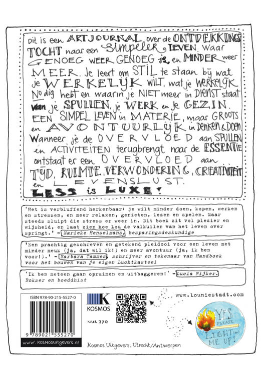 "Less is Luxe" is het nieuwe art journal van Lou Niestadt over de ontdekkingstocht naar een simpeler leven. Waar genoeg genoeg is en minder meer. Je leert om stil te staan bij wat je werkelijk wilt en wat je werkelijk nodig hebt. Een simpel leven in materie, maar groots in denken en doen, waarin je niet meer continu in dienst staat van je spullen, je werk, je gezin.