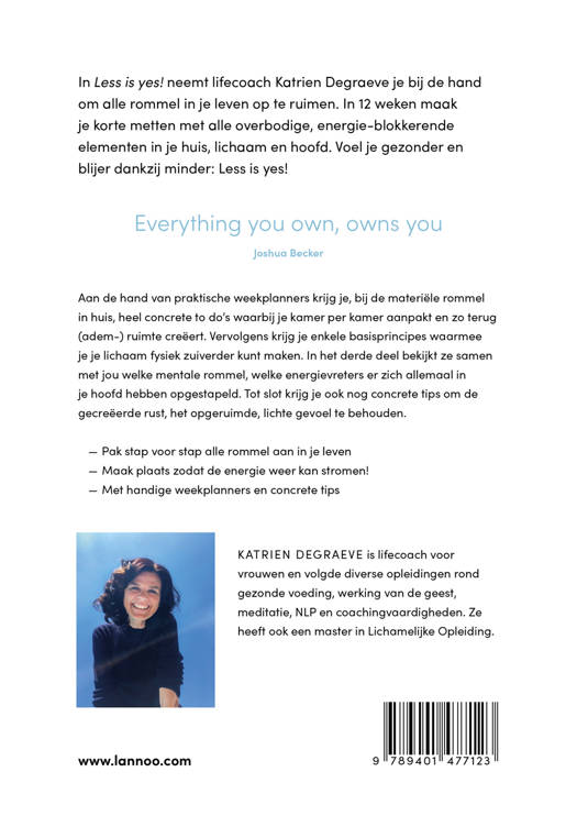 In Less is yes! neemt lifecoach Katrien Degraeve je bij de hand om alle rommel in je leven op te ruimen. In 12 weken maak je korte metten met alle overbodige, energie-blokkerende elementen in je huis, lichaam en hoofd. Voel je gezonder en blijer dankzij minder: Less is yes!