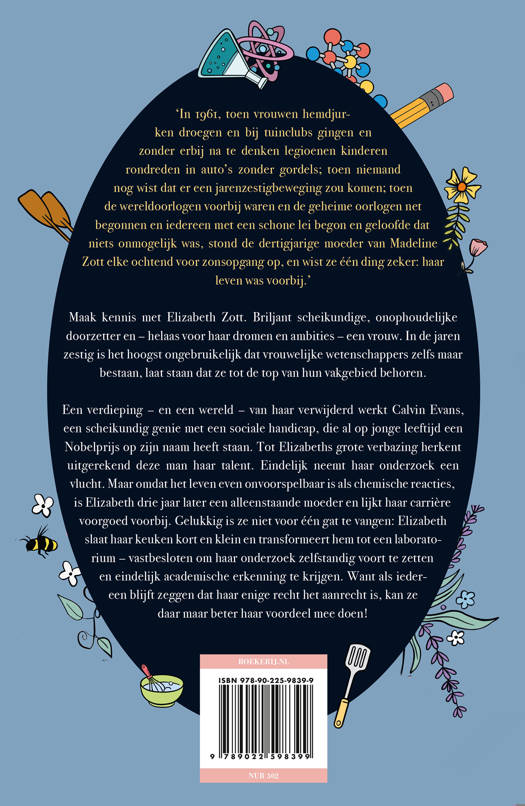 Maak kennis met Elizabeth Zott. Briljant scheikundige, onophoudelijke doorzetter en – helaas voor haar dromen en ambities – een vrouw. In de jaren zestig is het hoogst ongebruikelijk dat vrouwelijke wetenschappers zelfs maar bestaan, laat staan dat ze tot de top van hun vakgebied behoren.