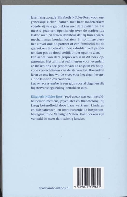 De in dit boek opgenomen gesprekken zijn met recht lessen voor levenden: ze maken ons deelgenoot van de angsten en hoopvolle verwachtingen van de stervenden. Bovendien leren ze ons hoe wij de vrees voor ons eigen levenseinde kunnen overwinnen.