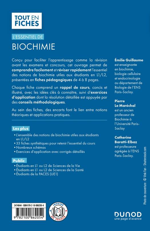 Conçu pour faciliter l’apprentissage comme la révision avant les examens et concours, cet ouvrage permet de comprendre facilement et réviser rapidement l’essentiel des notions de biochimie utiles aux étudiants en L1/L2, présentées en fiches pédagogiques de 4 à 8 pages. Chaque fiche comprend un rappel de cours, concis et illustré, avec les idées clés à connaître, suivi d’exercices d’application dont la résolution détaillée est appuyée par des conseils méthodologiques. Au sein des fiches, des encarts font le lien entre notions théoriques et applications pratiques.