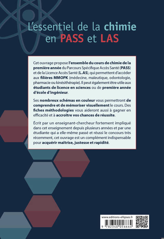 Cet ouvrage propose l’ensemble du cours de chimie de la première année du Parcours Spécifique Accès Santé (PASS) et de la Licence Accès Santé (L.A.S.), qui permettent d’accéder aux filières MMOPK (médecine, maïeutique, odontologie, pharmacie ou kinésithérapie). Il peut également être utile aux étudiants de licence en sciences ou de première année d’école d’ingénieur.