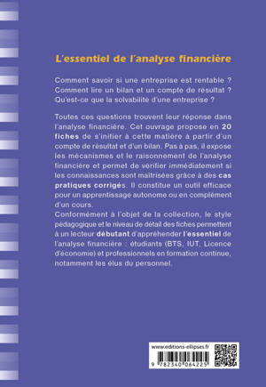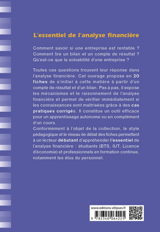 Conformément à l’objet de la collection, le style pédagogique et le niveau de détail des fiches permettent à un lecteur débutant d’appréhender l’essentiel de l’analyse financière : étudiants (BTS, IUT, Licence d’économie) et professionnels en formation continue, notamment les élus du personnel.