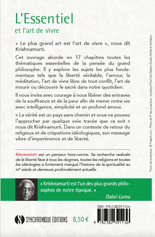 « Le plus grand art est l’art de vivre », nous dit Krishnamurti. Cet ouvrage aborde en 17 chapitres toutes les thématiques essentielles de la pensée du grand philosophe. Il y explore les sujets les plus fondamentaux tels que la liberté véritable, l’amour, la méditation, l’art de vivre libre de tout conflit, l’art de mourir ou découvrir le sacré dans notre quotidien. Il nous invite avec courage à nous libérer des entraves de la souffrance et de la peur afin de mener notre vie avec intelligence, simplicité et un profond amour. « La vérité est un pays sans chemin et vous ne pouvez l’approcher par quelque voie tracée que ce soit » nous dit Krishnamurti. Dans un contexte de retour du religieux et de crispations idéologiques, son message vibre d’impertinence et de liberté. Krishnamurti est un penseur hors-norme. Sa recherche radicale de la liberté face à tous les dogmes, toutes les religions et toutes les idéologies a fortement marqué l’histoire de la spiritualité au XXe siècle et demeure profondément actuelle.
