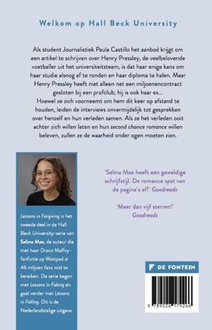 Paula Castillo is vastbesloten haar leven weer op de rails te krijgen. En na een lange tijd aan de metaforische zijlijn te hebben gestaan, besluit ze een profiel over een opkomende HBU-voetballegende te schrijven. Het probleem: Henry Pressley heeft het afgelopen jaar niet alleen een contract van een miljoen dollar getekend met een MLS-club, hij heeft het ook uitgemaakt met Paula. Hoewel ze zichzelf voorhoudt dat ze dit keer echt haar afstand zal kunnen houden van de wervelwind die Henry is, monden de interviews uit in gesprekken over henzelf, en over hun verleden samen. Als ze ooit het verleden achter zich willen laten en hun second chance romance willen beleven, zullen ze de waarheid onder ogen moeten zien… 'Lessons in Forgiving' is het eerste deel in de Hall Beck University-serie van Selina Mae, de auteur die met haar Draco Malfoy-fanfictie op WordPadd al 40 miljoen fans wist te bereiken. De serie begint met 'Lessons in Faking'.