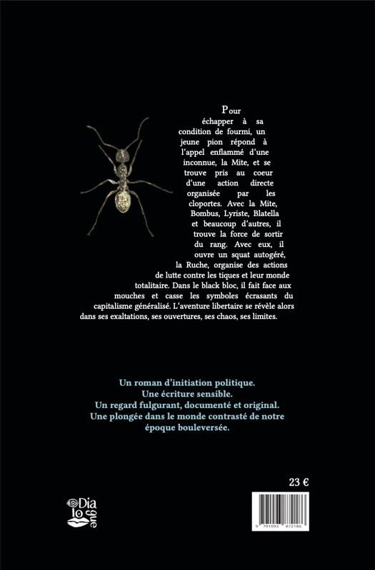 Pour échapper à sa condition de fourmi, un jeune pion répond à l’appel enflammé d’une inconnue, la Mite, et se trouve pris au coeur d’une action directe organisée par les cloportes. Avec la Mite, Bombus, Lyriste, Blatella et beaucoup d’autres, il trouve la force de sortir du rang. Avec eux, il ouvre un squat autogéré, la Ruche, organise des actions de lutte contre les tiques et leur monde totalitaire. Dans le black bloc, il fait face aux mouches et casse les symboles écrasants du capitalisme généralisé. L’aventure libertaire se révèle alors dans ses exaltations, ses ouvertures, ses chaos, ses limites.