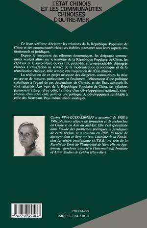 Ce livre s'efforce d'éclairer les relations de la République Populaire de Chine et des communautés chinoises établies outre-mer sous leurs aspects institutionnels et juridiques. Depuis le lancement des réformes économiques, les dirigeants communistes veulent attirer sur le territoire de la République Populaire de Chine, les capitaux et le savoir-faire de ces fils, petits-fils et arrière-petit-fils d'émigrés chinois. L'émigration au service de la modernisation économique et de la réunification étatique, elle semble être l'aspiration de l'État chinois. La réalisation de ce projet nécessite des dirigeants communistes la mise en œuvre de mesures particulières, et finalement, l'élaboration d'une politique spécifique à l'égard de ces descendants de Chinois, et des États auxquels ils sont rattachés. Aux yeux de la République Populaire de Chine, ces relations paraissent clayer, d'un côté, la thèse d'un développement national, sinochinois, d'un autre côté, justifier une politique de développement semblable à celle des Nouveaux Pays Industrialisés asiatiques.