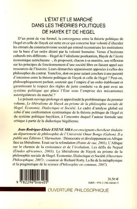 Les théories politiques de Hegel et Hayek convergent dans leur opposition aux philosophies constructivistes du contrat : chacun à sa manière propose une réflexion sur les principes de fonctionnement d'une société libre en mobilisant les ressources de l'histoire. Les divergences apparaissent au sujet de la fonction de l'Etat et du marché dans leur théorie politique respective.