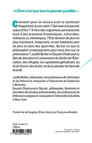Comment peut-on encore avoir le sentiment d'appartenir à une nation ? Qui exerce le pouvoir aujourd'hui ? À l'ère des migrations permanentes dues à des pressions économiques, culturelles, militaires ou climatiques, l'État devient de plus en plus transitoire, temporaire, et ses habitants sont de plus en plus des apatrides. Qu'est-ce que la philosophie contemporaine peut nous dire sur ce phénomène ? Judith Butler et Gayatri Chakravorty Spivak discutent ici notamment du déclin de l'État-nation, des réfugiés, du capitalisme globalisant, du droit d'avoir des droits, et de la pensée de Hannah Arendt.