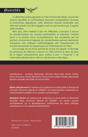 La détention avant jugement en Côte d'Ivoire fait débat. Quand elle devient injustifiée et systématique, favorisant surpopulation carcérale et traitements dégradants, cette détention devient intolérable. Des réformes pénales ont été engagées mais ne parviennent pas à juguler cette situation. Bien plus, elles mettent à jour les difficultés à parvenir à penser les transformations du système pénitentiaire et judiciaire. L'intérêt porté à la tension entre incompréhension des procédures par les premiers concernés et logiques de standardisation permet néanmoins d'esquisser une réflexion méthodologique afin d'appréhender de manière renouvelée les dynamiques sur l'enfermement et l'État. Cet ouvrage est né d'une volonté de croiser les regards. Il interroge les processus de réforme à l'oeuvre en Côte d'Ivoire et dans les pays de la région subsaharienne pour mettre à jour « l'impensé » de l'internationalisation de la réforme pénale dans cette région.