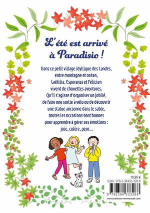 Les aventures drôles et tendres d’un trio d’amis au grand cœur ! Laetitia, Félicien et Esperanza habitent à Paradisio, un petit village au pied des Pyrénées. Connus de tout le village, les trois héros de sept ans sont suivis partout par le chaton Alba et la colombe Paloma. Une envie de grand air et d’espace dans le cœur, ils partent à l’aventure du haut de leurs petites jambes ! 3 histoires autour des émotions dans ce premier tome : -Jubilez ! : un grand événement se prépare au village, mais dans l’effervescence des préparatifs, comment se concentrer sur l’Essentiel ? Un roman sur la JOIE. -Félicien n’a plus peur : Félicien rencontre le berger du village, dont il a toujours eu peur. Mais avec ses amies Laetitia et Esperanza, ils vont apprendre à mieux le connaître. Un roman pour apprendre à vaincre la PEUR. -Esperanza et la Belle Dame : Laetitia veut toujours faire la chef et dire aux autres à quoi jouer, ce qui met Esperanza en colère.