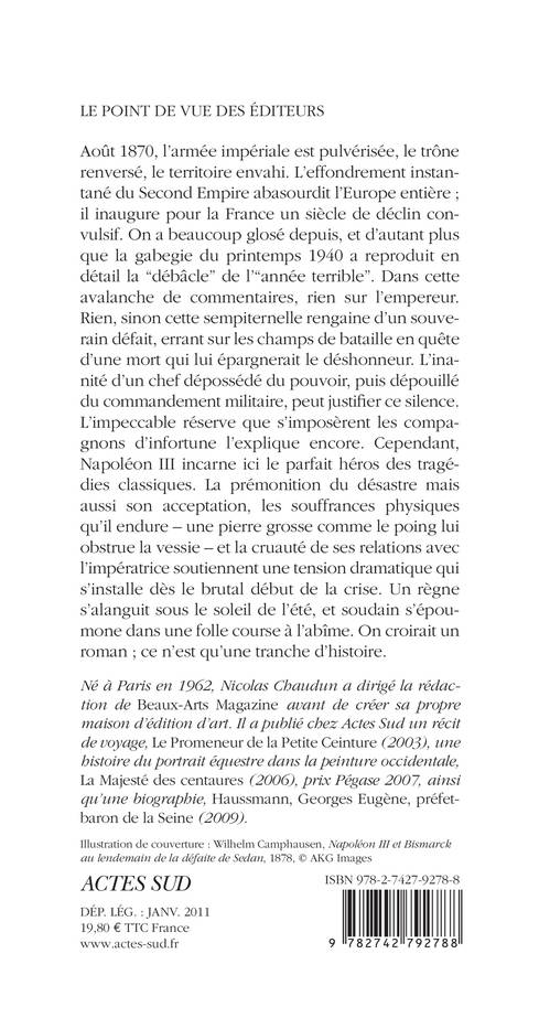 De 1870, on conserve le souvenir d'un désastre. D'autres ont suivi, comblant l'abîme où la guerre avait précipité Napoléon III. «L'été en enfer» est l'histoire de ce plongeon vertigineux, le "road movie", en quelque sorte, de l'errance impériale, chaotique, solitaire, et si cruelle qu'elle érige la gabegie en véritable tragédie classique.