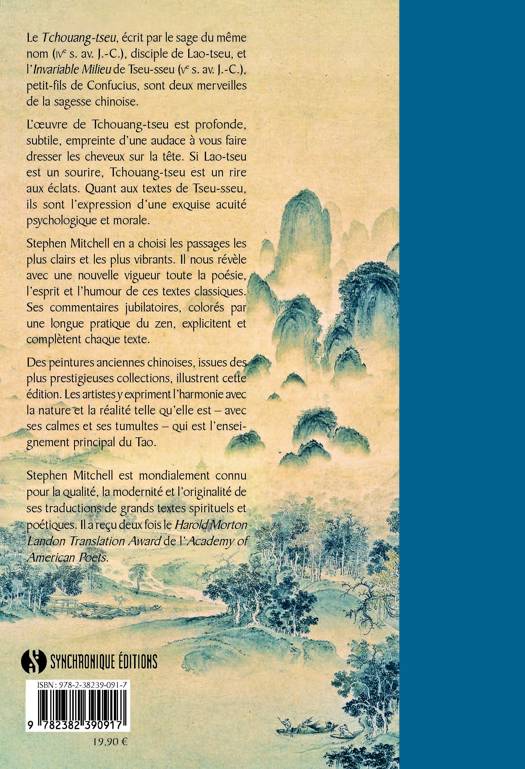 Le Tchouang-Tseu, écrit par le sage du même nom (IVe s. av. J.-C.), disciple de Lao-tseu, et l’Invariable Milieu de Tseu-sseu (Ve s. av. J.-C.), petit-fils de Confucius, sont deux merveilles de la sagesse chinoise. L’œuvre de Tchouang-tseu est profonde, subtile, empreinte d’une audace à vous faire dresser les cheveux sur la tête. Si Lao-tseu est un sourire, Tchouang-tseu est un rire aux éclats. Quant aux textes de Tseu-sseu, ils sont l’expression d’une exquise acuité psychologique et morale. Stephen Mitchell en a choisi les passages les plus clairs et les plus vibrants. Il nous révèle avec une nouvelle vigueur toute la poésie, l’esprit et l’humour de ces textes classiques. Ses commentaires jubilatoires, colorés par une longue pratique du zen, explicitent et complètent chaque texte. Des peintures anciennes chinoises, issues des plus prestigieuses collections, illustrent cette édition. Les artistes y expriment l’harmonie avec la nature et la réalité telle qu’elle est – avec ses calmes et ses tumultes – qui est l’enseignement principal du Tao. Stephen Mitchell est mondialement connu pour la qualité, la modernité et l’originalité de ses traductions de grands textes spirituels et poé tiques. Il a reçu deux fois le Harold Morton Landon Translation Award de l’Academy of American Poets.