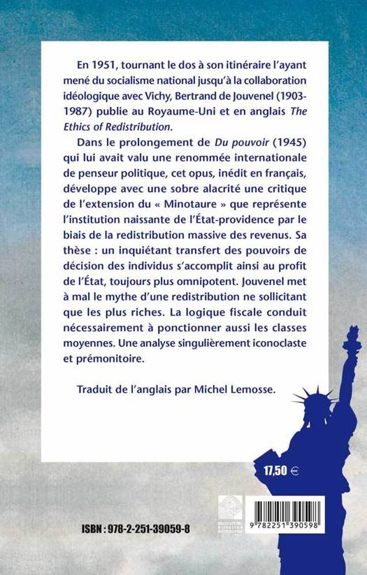 English summary: Betrand de Jouvenel offers in this 1951 study a scathing critique of the emerging welfare state, focusing in particular on the loss of decisional power from the individual to the state. He likewise argued that the fiscal apparatus would draw on the resources of the middle class, and not just the rich. French description: En 1951, tournant le dos a son itineraire l'ayant mene du socialisme national jusqu'a la collaboration ideologique avec Vichy, Bertrand de Jouvenel (1903-1987) publie au Royaume-Uni et en anglais The Ethics of Redistribution. Dans le prolongement de Du pouvoir (1945) qui lui avait valu une renommee internationale de penseur politique, cet opus, inedit en francais, developpe avec une sobre alacrite une critique de l'extension du Minotaure que represente l'institution naissante de l'Etat-providence par le biais de la redistribution massive des revenus. Sa these: un inquietant transfert des pouvoirs de decision des individus s'accomplit ainsi au profit de l'Etat, toujours plus omnipotent. Jouvenel met a mal le mythe d'une redistribution ne sollicitant que les plus riches. La logique fiscale conduit necessairement a ponctionner aussi les classes moyennes. Une analyse singulierement iconoclaste et premonitoire.