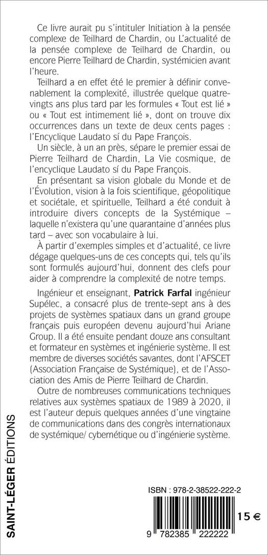 À côté des visions scientifique, géopolitique et sociétale, théologique et spirituelle, cet ouvrage propose une vision transverse et peu connue de l’oeuvre de Pierre Teilhard de Chardin, sa vision « systémique ». C’est l’occasion de présenter au lecteur une introduction à la systémique et aux sciences de la complexité, que Teilhard de Chardin apparaît comme ayant été le premier à concevoir dans leur ensemble. La complexité, partie intégrante de la systémique, y est dégagée à partir de textes de celui qui l’a définie sans ambiguïté pour la première fois, Teilhard de Chardin. L’actualité de cette vision, cohérente avec les réflexions de penseurs actuels, et en particulier en lien fort avec l’Encyclique Laudato sí, qu’un siècle sépare du premier essai de Teilhard de Chardin, La Vie cosmique, et qui fait largement usage de l’expression « Tout est lié », est mise en évidence.