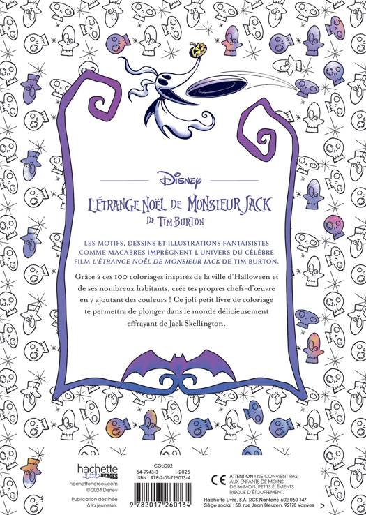 Les motifs, dessins et illustrations fantaisistes comme macabres imprègnent l'univers du célèbre film L'étrange Noël de Monsieur Jack de Tim Burton. Grâce à ces 100 coloriages inspirés de la ville d’Halloween et de ses nombreux habitants, crée tes propres chefs-d’oeuvre en y ajoutant tes couleurs ! Ce joli petit livre de coloriage te permettra de plonger dans le monde délicieusement effrayant de Jack Skellington et donner tes plus belles nuances aux monstres de la ville.