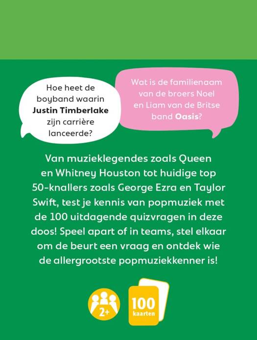 Van muzieklegendes zoals Queen en Whitney Houston tot huidige top 50-knallers zoals George Ezra en Taylor Swift, test je kennis van popmuziek met de 100 uitdagende quizkaarten in deze doos! Hoe heet de boyband waarin Justin Timberlake zijn carrière lanceerde? En wat is de familienaam van de broers Noel en Liam van de Britse band Oasis ook alweer? Speel apart of in teams, stel elkaar om de beurt een vraag en ontdek wie de allergrootste popmuziekkenner is! Geschikt vanaf twee spelers.