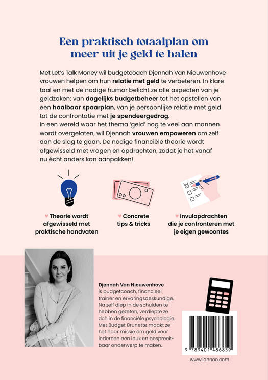 Met Let's Talk Money wil budgetcoach Djennah Van Nieuwenhove vrouwen helpen om hun relatie met geld te verbeteren. In klare taal en met de nodige humor belicht ze alle aspecten van je geldzaken: van dagelijks budgetbeheer tot het opstellen van een haalbaar spaarplan, van je persoonlijke relatie met geld tot de confrontatie met je spendeergedrag.