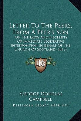 ""Letter To The Peers, From A Peer�������s Son: On The Duty And Necessity Of Immediate Legislative Interposition In Behalf Of The Church Of Scotland"" is a book written by George Douglas Campbell in 1842. The book is a letter addressed to the peers of Scotland, urging them to take immediate legislative action to protect the Church of Scotland. The author argues that the church is in danger of being undermined by the government's interference and that it is the duty of the peers to intervene and protect the church's interests. The book provides a historical context for the situation, discussing the history of the church and the political landscape of Scotland. The author draws on his own experiences and knowledge of the church to make a compelling case for the need for immediate action. The book is a passionate plea for the protection of the Church of Scotland and an important historical document that sheds light on the religious and political tensions of the time.As Determined By Considerations Of Constitutional Law.This scarce antiquarian book is a facsimile reprint of the old original and may contain some imperfections such as library marks and notations. Because we believe this work is culturally important, we have made it available as part of our commitment for protecting, preserving, and promoting the world's literature in affordable, high quality, modern editions, that are true to their original work.