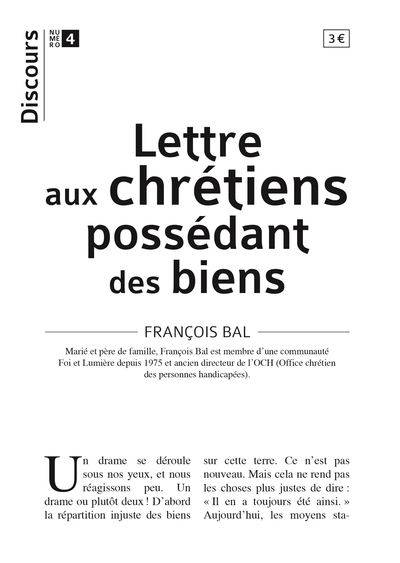 « Discours » la nouvelle collection de Pierre Téqui éditeur. Cette collection comprend des textes courts et percutants pour aller directement à l'essentiel des enjeux de notre époque. Des textes d'opinion, d'histoire, de doctrine, de philosophie, de vie... Dans ce numéro 4, François Bal fait le point sur le partage que le chrétien est appelé à faire de ses biens. Il montre le chemin de vie ouvert par la rencontre vraie avec les personnes pauvres, à rebours des ghettos que certains voudraient créer ou de la lutte des classes. À propos de François Bal : Marié et père de famille, François Bal est membre d'une communauté Foi et Lumière depuis 1975, et ancien directeur de l'OCH (Office chrétien des personnes handicapées).