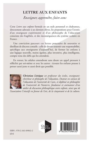 Cette Lettre aux enfants formule en un style personnel et chaleureux, directement adressée à ses derniers élèves, les propositions pour l'avenir, d'un enseignant expérimenté et d'un philosophe de l'éducation conscient des fragilités, et des inconséquences du système scolaire en France. Une conviction parcourt ces lettres : celle de devoir soutenir une responsabilité, spécifique aux enseignants, et celle de former les enfants à une logique nouvelle, moins égoïste, plus inventive, plus intelligente, compte tenu des défis qui les attendent.