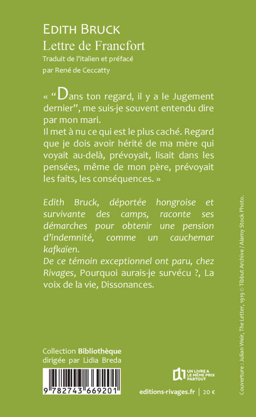 « Dans ton regard, il y a le Jugement dernier, me suis-je souvent entendu dire par mon mari. Il met à nu ce qui est le plus caché. Regard que je dois avoir hérité de ma mère qui voyait au-delà, prévoyait, lisait dans les pensées, même de mon père, prévoyait les faits, les conséquences. » Edith Bruck, déportée hongroise et survivante des camps, raconte ses démarches pour obtenir une pension d'indemnité, comme un cauchemar kafkaïen.