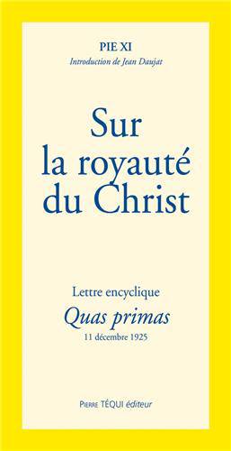 Quas primas est un des textes majeurs de Pie XI car c'est par lui qu'a été instituée la fête du Christ-Roi. Ce culte ayant pour objectif de s'opposer au laïcisme, au naturalisme, au relativisme et aux formes vagues de religiosité. « Pour ramener et consolider la paix, nous ne voyons pas de moyen plus efficace que de restaurer la souveraineté de Notre-Seigneur. » C'est pourquoi les thèmes de cette encyclique sont les titres du Christ à la royauté, la nature et l'importance de cette royauté, les bienfaits de la souveraineté du Christ et les moyens d'assurer ces bienfaits. Une intéressante introduction de Jean Daujat permet de mieux saisir l'importance actuelle de ce texte et de comprendre le principe de royauté du Christ, dans la mesure où on ne cesse de constater la corruption de l'état de l'humanité alors qu'il est impossible d'aboutir à une paix authentique hors du Règne du Christ. A propos de Pie XI Pie XI fut pape de 1922 à 1933. Son pontificat est marqué par le règlement de la question romaine, avec la reconnaissance et l'institution de l'État de la Cité du Vatican, par les accords du Latran, en 1929. Il est confronté à la montée du communisme, du fascisme et du nazisme qu'il combat.