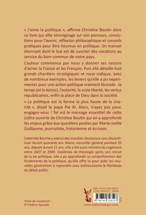 1) POURQUOI S’ENGAGER ? Pour le service de la RES PUBLICA, pour le bien commun et par amour de la France et de sa grandeur, dont elle détaille un certain nombre de jalons majeurs. Elle insiste aussi sur le fait que tous les politiciens ne sont pas pourris, qu’il y a d’ailleurs les mêmes dangers dans la vie économique et en entreprises, et que l’engagement politique est utile et source de grandes joies. 2) LES 7 CHANTIERS DE LA RECONSTRUCTION : Christine Boutin ne masque pas les difficultés que notre pays traverse. Elle détaille 7 domaines : l’État, la France et l’Europe, la défense de la langue française, la gestion (difficile) de l’immigration, la vraie protection de la femme, les lois de bioéthique, la régulation de l’IA. Elle lance même un cri d’alarme pour l’avenir de l’homme, s’appuyant sur le philosophe Romano Guardini. 3) LES SECRETS DE L’ART POLITIQUE : elle nous livre enfin, avec nombres d’exemples les leviers pour une action politique vraiment efficace et au service du pays :