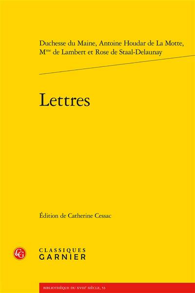 Les lettres réunies dans ce volume émanent principalement de deux figures importantes de la première moitié du XVIIIe siècle dont les vies furent étroitement liées : la duchesse du Maine et Mme de Staal-Delaunay. La correspondance de la duchesse du Maine et d'Antoine Houdar de La Motte fut écrite en 1726 dans le contexte de sociabilité du salon de Mme de Lambert. Une partie des lettres de Rose de Staal-Delaunay fut adressée à deux de ses plus grandes passions, le marquis de Silly et le chevalier de Ménil, ainsi qu'à son amie Mme du Deffand. L'ensemble de ces lettres recourt au style enjoué en faveur à cette époque, émaillé de réflexions philosophiques, tout en laissant affleurer une grande palette d'émotions, des plus ténues aux plus profondes.